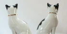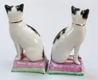 This is a stunning pair of antique Staffordshire porcelain mantle cats. Made in England, these cats bring a touch of elegance to any home decor. The intricate hand-painted details and unique colors of black, white, pink, green, and gold make these cats a true work of art. These mantle cats are a rare find and would make a valuable addition to any collection of other antiques. The cats are in excellent condition and have been well preserved over the years. Their style and design are perfect for adding a touch of old-world charm to any room in your home. Kept in curio cabinet. Each cat 7" tall 4" wide. No Crazing, cracks, or repairs. Shipped double boxed.
