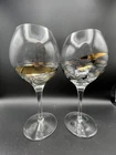 Pair of Stimas Romania 8” Tall Stemware Stained Glass Red Wine Glasses, hand-blown and decorated with an abstract design. The set includes two red wine glasses, perfect for all occasions. Made of glass, the contemporary style glasses feature a round shape and stand 8 inches tall and 8.25” tall. Each glass is adorned with a unique abstract pattern, adding a touch of elegance to your dining experience. Original sticker.