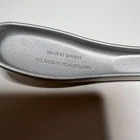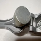The Pampered Chef Garlic Press #2576 is a silver metal kitchen tool used for pressing garlic. It is designed to efficiently crush garlic cloves with ease.