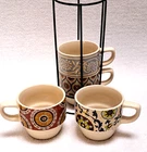 Add a touch of style to your coffee or tea time with this Pier 1 mug set. The set includes four ceramic mugs featuring a multicolor paisley pattern that adds a contemporary twist to your kitchen. The mugs are stackable, making storage simple. They also come with a round black vertical rack for easy storage. Each mug holds up to 8 fl oz and measures 3 inches deep. This coffee tea mug set is perfect for all occasions and can be personalized if desired.