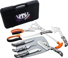 Game Knife Set Includes: 12" Boning Knife; 9-1/2" Gut-Hook Skinner; 8-1/2" Hawkbill blade knife; 8-1/2" Caping Knife; 12" Gut-Hook Butcher Axe; 10-1/2" Skinning Cleaver; 8-1/2" Bone Saw; Ribcage Spreader (6-7/8" to 12"); 9-1/4" Game Shear; 11-7/8" * 7-7/8" Cutting Board; Knife and Shear Sharpener; Cleaning Gloves. Materials and Designs: Handles are all in black-and-blue camo colours with ergonomic materials for concealing and non-slip purposes. Handles and blades are manufactured in great balance in multiple practices. Blades are made of 7cr17mov steel and have experienced 7 times heat-treated tests to ensure their hardness and durability. Portable and Organized: Our knife set almost has all the tools and knives you need for the game, you can take the set everywhere you go and keep them all in case. Warm Notice: All tools should be kept in place for safe use. Always be aware of the blades while in use. Clean the knives after use is necessary for the long run. Satisfaction Guaranteed: We provided a solid warranty and friendly 24/7 customer service to make sure your purchase was worry-free. Product Description Game Knife Includes 12" Boning Knife; 9-1/2" Gut-Hook Skinner; 8-1/2" Hawkbill blade knife; 8-1/2" Caping Knife; 12" Gut-Hook Butcher Axe; 10-1/2" Skinning Cleaver; Other Accessories Includes 8-1/2" Bone Saw; Ribcage Spreader (6-7/8" to 12") 9-1/4" Game Shear 11-7/8" * 7-7/8" Cutting Board Knife and Shear Sharpener Cleaning Gloves 9-1/2" Gut-Hook Skinner 8-1/2" Caping Knife 10-1/2" Skinning Cleaver 12" Boning Knife 8-1/2" Hawkbill Blade Knife 12" Gut-Hook Butcher Axe 12" Gut-Hook Butcher Axe Enough for cutting big size wood or bones, designed for all tough tasks. 8-1/2" Hawkbill blade knife Ideal for skinning, cutting, and carving. 10-1/2" Skinning Cleaver Blade covers the head to tail, ideal for cutting the long slice of meat. Rib Spreader Spread the ribcage from 6-7/8" to 12". 8-1/2" Bone Saw To avoid shattering the bladder or intestines, the wood & bone saw is intelligently built with a blunt tip. 12" Boning Knife The boning knife is ideal for multi-purpose uses such as filleting, skinning, and trimming, the most important character in the family.