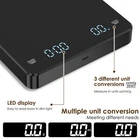 Parts List: 1×Electronic Scale 1×USB Cable 1×Instruction Manual Highlight description: [0.1g-3kg High Precision and Timing Function] This mini electronic scale has 4 built-in high-precision weighing sensors and 1 high-performance chip, with 0.1g-3kg accuracy and more accurate weighing. The timer is accurate to 15 seconds, and the timing can up to 99 minutes and 59 seconds, convenient to control the brewing time. [Support 3 Different Units] This digital kitchen scale supports 3 different units: oz/ml/g switching. It can weigh solids, liquids, powders, and also be used in various scenarios, like espresso brewing, cooking, baking, milk powder and meal prep. [Waterproof and High Temperature Resistant] This mini food scale is made of premium ABS scale surface and frame with high temperature resistant surface (135°C), waterproof and durable, effortless to clean and maintain. It has high-sensitivity touch buttons, two sets of buttons, easy to understand and use. [LED Display] This coffee scale adopts a high-definition LED screen display, integrated molding, and an 89x16mm display window, which is easy to read even in dim or dazzling environments. The 150x130x22.5mm compact size is easy to be placed in a kitchen drawer or carried on outdoor camping trips. [Rechargeable and Auto Off] The mini scale adopts Type-C rechargeable design and comes with a USB cable (without charging head), no need to replace or buy new batteries frequently. It can be used for about 3 months on a single charge. You can also use 2 AAA batteries (not included). The default automatic shutdown function is 3 minutes without operation, increasing battery life and more energy-saving and eco-friendly. Detailed description: Description: This high precision digital kitchen scale is precise to measure of 0.1g-3kg and has timing function. It is multifunctional and supports oz/ml/g switching, meeting different needs. It is waterproof and has LED display, easy to read. It supports USB charging (without charging head) and battery operated (not included). Feature: Indication: It has low battery and overload indication to facilitate customers to replace the battery in time and use it correctly, thus extending life. Multifunctional: This scale will be a great helper in your kitchen. This mini weight scale is easy to operate, and can also be a multi-functional kitchen scale when the timing function is not needed. Specification: Product Name: Digital Kitchen Scale Power supply method: 2 AAA batteries (not included), USB cable (charging head not included) Material: PC+ABS plastic Size: 15x13x2.25cm Load-bearing: 0.1g-3000g Power supply: 3.7v/200-400mAh Color: Black Notes: 1.The coffee scale must be placed on a very stable and level platform as even small vibrations can affect the reading. If you get erratic readings, try recalibrating or replacing the batteries. Avoid shaking, dropping or subjecting the scale to vibration. This is a precision instrument and must be used with extreme care. 2.There may be slight differences between the picture and the actual color of the commodity. We will try our best to show you the exact color. 3.Please allow slight dimension difference due to manual measurement.