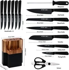 Knife Set, 15-Piece Kitchen Knife Set with Block Wooden German Stainless Steel.... Item Description: 【High-grade Anti-rust Coating And Easy To Clean】Are you still using ordinary knives?The black coating prevents the steel from oxidizing, so kitchen knife set will stay non-stick and rust-resistant for years to come. 【Multi-purpose】Perfect mix design, suitable for professional applications, with functions for various purposes, can chop, slice, shred all kinds of meat, vegetables, fruits and bread. Suitable for home and restaurant use. 【15 Pieces Kitchen Knife Set】One set of 15 pcs, one banquet of journey! 8”Chef Knife, 8”Slicing Knife, 7”Santoku Knife,8”Bread Knife,5”Utility Knife,3.5”Paring Knife, 5'' Kitchen Scissors,1 * Knife Sharpener,6 * 4.5”Steak Knives. 【High carbon stainless steel blades】Thanks to our autonomous steelmaking technology (development for knives), makes it easy to stay sharp. You can do everything for a long time from slicing, chopping, dicing, all made effortless. 15° blade angles allowed for paper-thin cuts that were consistent from start to finish, even on a slippery tomato.