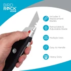 PREMIUM UTILITY KNIFE SET: Experience reliable cutting with the INTERNET'S BEST Premium Utility Knife Set. Designed for heavy-duty tasks, it features a durable metal body with a comfortable rubber handle. Ideal for various cutting needs, including cardboard, carpet, and plastic. RETRACTABLE BLADE: Each knife in the set features an adjustable retractable blade, allowing precise cutting with ease. The blade can be safely retracted into the metal frame after use, providing added convenience. Ideal for both work and everyday tasks. QUICK-CHANGE MECHANISM: The quick-change mechanism allows easy blade replacements. Simply extend the blade, press the red button to release, and swap in a new razor blade. This design enables swift blade changes, keeping you ready for any task. EXTRA BLADES INCLUDED: The set comes with a refill pouch containing five additional blades, ensuring long-term use and convenience. The extra blades are easy to store and access, making sure you are always prepared for any cutting task without the need for immediate replacements. DIMENSIONS AND USE: Each knife measures 1.5 inches in width and 6 inches in length. The package includes two utility knives and a refill pouch with five extra blades. Ideal for use as a cardboard cutter, box opener, carpet knife, package opener, and drywall cutter. Product Description Discover the BirdRock Brands Compact & Sturdy Utility Knife , the perfect tool for tackling any cutting task with ease. Designed for versatility, this heavy-duty knife is ideal for both DIY enthusiasts and professionals. Its ergonomic handle ensures comfort and precision in every use Ergonomic Utility Knife for Precise Crafting Cut Experience precise cuts with a premium utility knife designed for safety and accuracy. The retractable blade ensures smooth cutting, and the ergonomic handle provides comfort and control. Ideal for cutting through cardboard, carpet, plastic, and more in both DIY and professional tasks. Sturdy Utility Knife for Accurate Professional Cut Achieve clean, accurate cuts with a sturdy utility knife featuring a retractable, adjustable blade. This heavy-duty tool is designed for versatility and ease of use, making it perfect for cutting cardboard, packaging, and other materials with precision and durability. The video showcases the product in use. The video guides you through product setup. The video compares multiple products. The video shows the product being unpacked. Paper Cut through paper easily, perfect for crafts, packaging, and detailed projects. Rope Effortlessly slice through thick rope with the utility knife, ideal for outdoor or shipping needs. Carton Boxes Use the utility knife to open or resize sturdy carton boxes for storage, shipping, and organization. Leather Precisely trim leather for crafting, upholstery, and design projects using the utility knife. Maximize Versatility with Your All-in-One Cutter 1 Perfect Cuts 2 Slice Rope Cleanly 3 Quickly Open & Trim 4 Precision Cutting Experience a tool for precise, safe, and versatile cutting on any material Easy to Handle Designed for comfort and control, this utility knife offers a secure grip, making it easy to handle for both small and large cutting tasks." Adjustable Blade Quickly adjust the blade for different cutting depths. The retractable blade offers flexibility, ensuring precision and safety in any materials. Replacement Blades Equipped with easy-to-replace blades, this utility knife ensures you always have a sharp edge ready, keeping your work efficient and uninterrupted. Multiple Uses Ideal for cutting cardboard, carpet, plastic, and more. This versatile knife is built for a variety of tasks, from DIY projects to heavy-duty jobs Your Cutting-Edge Comparison Add to Cart Add to Cart Add to Cart Add to Cart Add to Cart Add to Cart Customer Reviews 4.8 out of 5 stars 15,888 4.8 out of 5 stars 15,888 4.6 out of 5 stars 26 4.2 out of 5 stars 13 4.6 out of 5 stars 9 3.9 out of 5 stars 4 Price $16.99 $ 16 . 99 $11.96 $ 11 . 96 $47.96 $ 47 . 96 $35.96 $ 35 . 96 $84.96 $ 84 . 96 $61.96 $ 61 . 96 Blade 5 5 5 5 5 5 Heady Duty ✔ ✔ ✔ ✔ ✔ ✔ Color Black Silver Black Silver Black Silver Set/Pack 2 2 10 10 20 20 Easy-to-replace ✔ ✔ ✔ ✔ ✔ ✔ Multiple Uses ✔ ✔ ✔ ✔ ✔ ✔