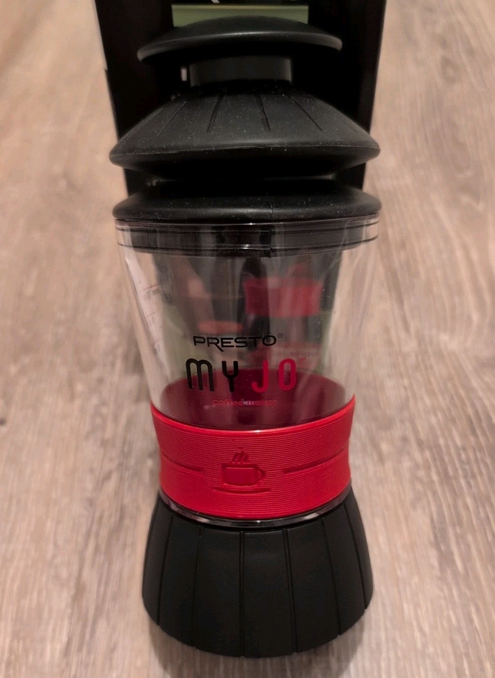 Lightly used. In excellent condition. The Presto MyJo Single Cup Coffee Maker 02835 is a compact and convenient coffee maker that can brew a single cup of coffee using pod technology. With a sleek clear, black, or red design, this manual coffee maker is easy to clean and made from durable plastic and rubber materials. The Presto brand is known for quality and reliability, making this single-cup coffee maker a practical choice for any home kitchen.