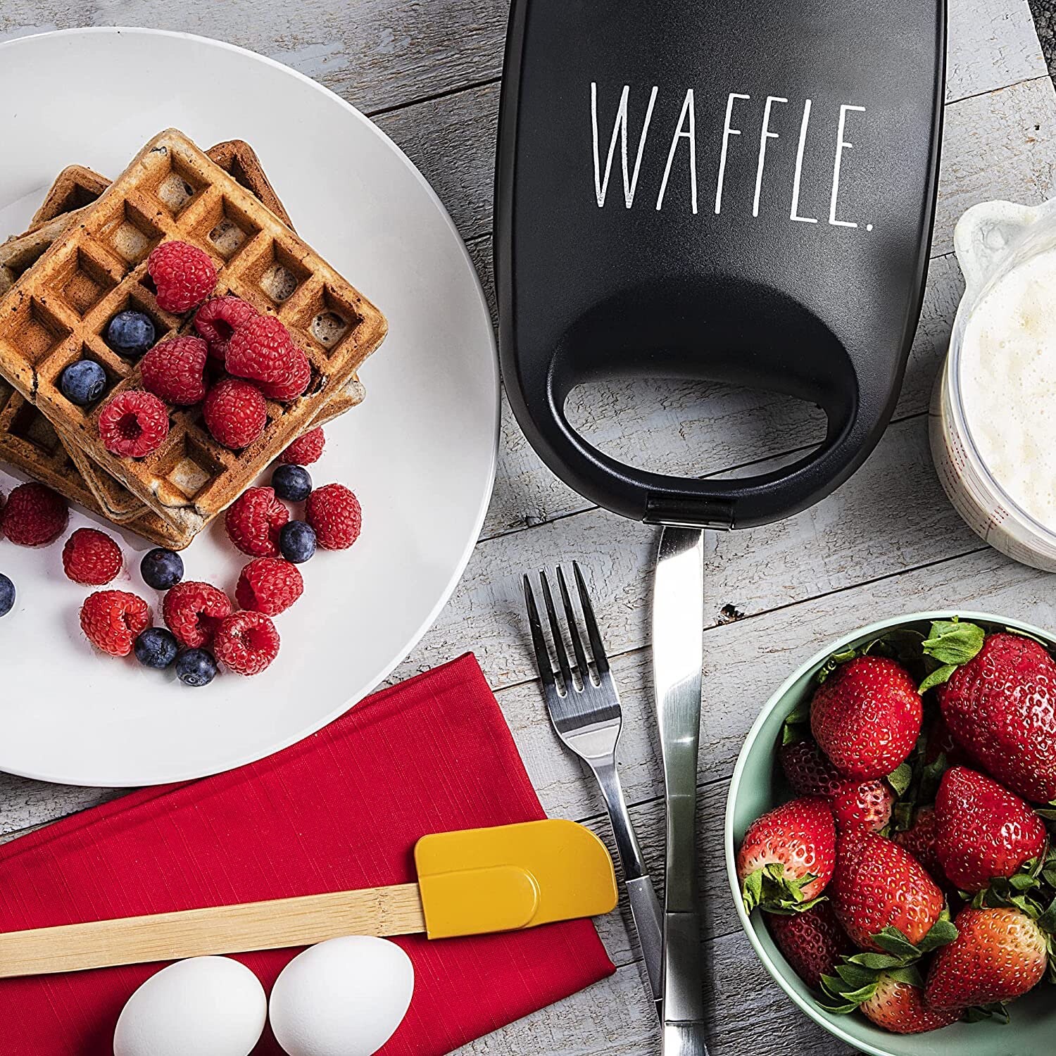 Elevate the style of your kitchen counter with our compact black Waffle Maker, adorned with Rae Dunn's signature font labeling it as "WAFFLE". This versatile appliance allows you to cook a variety of snacks such as waffles, eggs, hash browns, and more with ease. The cool touch locking handle ensures safe operation and portability, while the non-stick cooking plate makes cleaning up a breeze. Weighing in as lightweight and compact, this mini waffle maker is easy to store after use or take on the go. With a powerful 520-watt heating element, you'll enjoy fast cooking times. Our Rae Dunn Waffle Maker is an essential appliance you won't want to miss out on having in your kitchen.