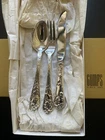 Reed & Barton Animals 3 piece Silver-plate Child set. Purchased at Gumps and in original box. Never used. Animal motif cats, dogs, bunnies, squirrel.