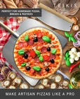 Make artisan pizzas like a pro ; Get the perfect slice every time with the finest baking tool you need to add in your kitchen, the Pizza Cutter Rocker and Pizza Peel Combo Set ; The pizza cutter rocker included in this set slices smoothly through your pizza crust without ruining your pizza toppings while the pizza peel lets you easily lift freshly baked pizza right out of the oven ; These tools will make you feel like you've moved to Napoli to perfect the art of pizza making Slice, dice, mince and chop with this multipurpose cutting tool ; Impeccably constructed to slice through thin crust and deep-dish pizzas, this slicer would give you 8 pizza slices in just 4 simple strokes ; And it doesn’t stop there, this blade rocker is also perfect for dicing, slicing, mincing and chopping vegetables, herbs, fruits, nuts and more ; Use it to divide dough, chop your choice of toppings, bake the pizza and finally cut it with this sleek cutter Achieve pro-level baking with this culinary tool ; Our premium peel features a thin 14 x 16 inch aluminum blade with a durable wooden handle allowing it to outperform all others in efficiency ; The thin sheet lets you easily slide your pizza, bread and pastries smoothly in and out of the oven and the wooden handle provides a good grip and minimal heat transfer so you can hold it comfortably while effortlessly transferring your baked goods The heavy duty pizza cutter is ergonomically crafted with a sharp metal rocker blade providing you with a clean and quick cut every time while its wooden handle gives a good base to easily cut through your pizza ; To make baking more convenient, the baking peel also comes with an adjustable wooden handle to accommodate to your needs in rotating and removing your pastries, pizzas and breads from your oven Teikis Pizza Cutter & Peel Set comes with a 2-Year Warranty ; This versatile baking tool set would surely make an excellent & perfect gift for the baking enthusiasts in your life or you can have it for yourself to make homemade pizza, bread and pastry easier and safer Product Description PIZZA METAL SLICER AND PADDLE BOARD PAN WITH WOOD HANDLE EASY TO USE The pizza cutter rocker slices smoothly through your pizza crust without ruining your pizza toppings while the pizza peel lets you easily lift freshly baked pizza right out of the oven. MULTIFUNCTIONAL Slice, dice, mince and chop with this multipurpose cutting tool. Perfect for dicing, slicing, mincing and chopping vegetables, herbs, fruits, nuts and more. HEAVY DUTY Our premium peel features a thin 14x16-inch aluminum blade with a durable wooden handle allowing it to outperform all others in efficiency. ERGONOMIC Comes with an adjustable wooden handle to accommodate to your needs in rotating and removing your pastries, pizzas and breads from your oven. MAKE ARTISAN PIZZAS LIKE A PRO NO MESS Our pizza cutter is crafted with a sharp metal rocker blade providing you with a clean and quick cut every time while its wooden handle gives a good base to easily cut through your pizza. BAKING MADE SAFE The thin sheet lets you easily slide your pizza, bread and pastries smoothly in and out of the oven and the wooden handle provides a good grip and minimal heat transfer so you can hold it comfortably while effortlessly transferring your baked goods. VERSATILE Get the perfect slice every time with the finest baking tool you need to add in your kitchen. Great for making homemade pizza, bread and pastry.