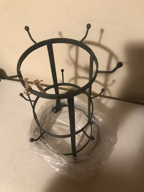 Here is a new tabletop mug rack, this is made o metal nad a dark smokey Black finish,It has 10 hooks on it to hang standard size mugs, holds 10 mugs on it, nice rustic mug storage rack and measures 9″ x 13″ MUGS and other items in picture NOT INCLUDED, IS FOR RACK ONLY