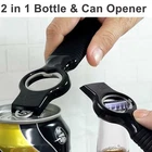 NEW DESIGN MULTIFUNCTIONAL 2 in 1 BOTTLE & CAN OPENER A great product for you to open beer bottle or soda can bottles. No more efforts to pop your tops off! You can even use the end to open pull tab can so that you’ll never break a nail when opening a beer can with this opener. Ergonomic rubber coating grip feels quite comfortable to the touch. A little thickness of this opener allows you to grab and pick it up with easy. Dimension is 6.9"*1.8"*0.6", the bottom of the handle has a round hole for hanging. Bright color make it very easy to find them in a drawer full of gadget. Suitable for bars, kitchens, backyard, RV, parties, outside bbq's etc. What You Get: Set of 2 black 2-in-1 beer bottle opener and soda/pop top can tab opener.Dimension: 6.9"(L)* 1.8"(W)* 0.6"(T), 2-Pack Black Head part is mainly made of super hard plastic - the topmost is used as soda can opener and the middle cirle, made of stainless steel, is used as bottle opener 4.2" long silicone handle provide great leverage to easily open bottles Perfect for bartender, arthirtic hand, senior and people with long nails Many colors available & 5-years