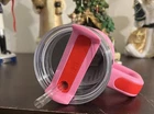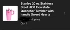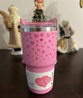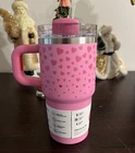 The Stanley Cup Valentine’s Day 2025 Ruby Red & Sweet Hearts 20 oz 2 Pack Tumblers are stainless steel insulated tumblers featuring a Valentine's Day theme with hearts design. They come in a set of two with lids and straws, suitable for hot or cold beverages. The tumblers have a drink-through lid, are red in color, and hold 20 ounces each. Ideal for teens, adults, and kids, this Valentine's Day model is made by Stanley in the United States.