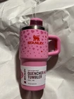 The Stanley Cup Valentine's Day Pink 20 oz H2.0 Flowstate Tumbler is a stainless steel tumbler featuring hearts and a Valentine's Day theme. It has a drink-through lid and is suitable for both hot and cold beverages. This insulated tumbler comes with a straw, making it convenient for on-the-go use. The model is designed for the 2025 Valentine's Day celebration, adding a festive touch to your drinkware collection. Share your love with the special ones in your life with a Valentine’s Quencher from Stanley 1913, exclusively at Target. Pick from the sweetest rich pink or deep red hues, featuring matching cascading hearts. Made for gifting, a card label is included that’s perfect for your Valentine’s Day baskets, best friends and even as a little something for yourself. Now with a handle, the 20-ounce Quencher H2.0 FlowState™ Tumbler matches the rest of the Quencher collection. Double-wall vacuum insulation keeps your drink the right temperature for hours. The versatile FlowState™ 3-position lid has three sip settings: one for the reusable straw, one without and the option to rotate the silicone cover shut. It fits right in your car cupholder when you’re headed to your Valentine’s Day celebration. Brand New Not responsible for any manufacturer's defects