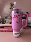 The "Stanley Cup Valentines 2025 Pink 40oz H2.0 Flowstate Tumbler" is a Valentine's Day-themed tumbler designed for both hot and cold beverages. It features a hearts pattern on a pink stainless steel body, with an insulated design to keep drinks at the desired temperature. This tumbler includes a drink-through lid and comes with a free straw topper, making it convenient for both sipping and on-the-go use. Ideal for those who want a stylish and functional option for their daily hydration needs, this tumbler is a part of the Valentine's collection by Stanley.