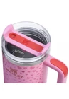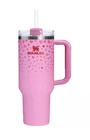 The product is a Stanley Tumbler in Pink, model 2025, with a 40oz capacity. It is made of stainless steel and is ideal for keeping beverages at the desired temperature. The design is suited for Valentine's Day with the Flowstate Quencher feature.