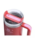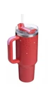 This is a Stanley Valentine's Day themed tumbler with a hearts pattern, suitable for both hot and cold beverages. It has a red color and features a drink-through lid and straw. The tumbler is made of stainless steel, insulated, and holds 40oz of liquid. Designed for Valentine's Day 2025, it is part of the H2.0 Flowstate model with a Bottle and Food & Drink theme. Made in the United States.