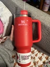 This is a Stanley brand Valentine's Day themed 40oz tumbler featuring a red color with hearts pattern. It is a H2.0 Flowstate model suitable for both hot and cold beverages. The tumbler is made of stainless steel, insulated, and comes with a lid and straw for convenient use. Made in the United States, it is a perfect gift for Valentine's Day 2025.