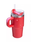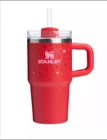 This is a Stanley Valentine's Day 2025 Ruby Hearts 20 oz Tumbler featuring a handle. It is designed for both hot and cold beverages, made of stainless steel, and comes with a drink-through lid and straw. The tumbler is insulated to maintain the temperature of the drink. The design is centered around Valentine's Day with a red color and heart pattern, making it a festive addition to the Bottle and Food & Drink themes.