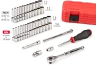 TEKTON 1/4 Inch Drive 12-Point Socket and Ratchet Set, 56-Piece Onesize Product Details Brand: TEKTON Drive System: Hex Finish Type: Polished Number of Pieces: 11 UPC: 020209991275 Manufacturer: TEKTON Part Number: SKT05304 Item Weight: 4.67 pounds Product Dimensions: 12.3 x 7.8 x 2.7 inches Item model number: SKT05304 Size: Onesize Finish: Polished Power Source: hand_powered Item Package Quantity: 1 Compatible Fastener Range: 0.25 inches Included Components: 2-pc. 1/4 in. drive extensions: 3, 6 in., 1-pc. 1/4 in. drive high-torque spinner handle, 11-pc. 1/4 in. drive deep 12-point sockets: 5/32, 3/16, 7/32, 1/4, 9/32, 5/16, 11/32, 3/8, 7/16, 1/2, 9/16 in., 14-pc. 1/4 in. drive deep 12-point sockets: 4, 4.5, 5, 5.5, 6, 7, 8, 9, 10, 11, 12, 13, 14, 15 mm, 14-pc. 1/4 in. drive 12-point sockets: 4, 4.5, 5, 5.5, 6, 7, 8, 9, 10, 11, 12, 13, 14, 15 mm, 1-pc. 1/4 in. drive universal joint, 11-pc. 1/4 in. drive 12-point sockets: 5/32, 3/16, 7/32, 1/4, 9/32, 5/16, 11/32, 3/8, 7/16, 1/2, 9/16 in., 1-pc. 1/4 in. magnetic hex bit holder, Storage case, 1-pc. 1/4 in. drive quick-release ratchet Batteries Required?: No Brand: TEKTON Drive System: Hex Finish Type: Polished Number of Pieces: 11 UPC: 020209991275 Includes 11-pc. 1/4 in. drive 12-point sockets: 5/32, 3/16, 7/32, 1/4, 9/32, 5/16, 11/32, 3/8, 7/16, 1/2, 9/16 in.; 11-pc. 1/4 in. drive deep 12-point sockets: 5/32, 3/16, 7/32, 1/4, 9/32, 5/16, 11/32, 3/8, 7/16, 1/2, 9/16 in.; 14-pc. 1/4 in. drive 12-point sockets: 4, 4.5, 5, 5.5, 6, 7, 8, 9, 10, 11, 12, 13, 14, 15 mm; 14-pc. 1/4 in. drive deep 12-point sockets: 4, 4.5, 5, 5.5, 6, 7, 8, 9, 10, 11, 12, 13, 14, 15 mm; 1-pc. 1/4 in. drive universal joint; 2-pc. 1/4 in. drive extensions: 3, 6 in.; 1-pc. 1/4 in. magnetic hex bit holder; 1-pc. 1/4 in. drive high-torque spinner handle; 1-pc. 1/4 in. drive quick-release ratchet; Storage case 12-point socket opening provides an ideal, exact fit for hex-shaped fastener heads Socket geometry is designed to apply force to flat sides of fasteners and not the corners, preventing round-off Extra-large die-stamped size markings are easy to read and can’t wear off Polished, chrome-plated finish easily wipes clean and is highly resistant to corrosion Four detent grooves provide a secure connection with the drive tool Beveled inner rim of the socket opening helps guide it smoothly onto fasteners Sockets come organized in a sturdy case that features strong latches and clear, molded markings for each tool The Tekton 1/4 Inch Drive 12-Point Socket & Ratchet Set includes every deep and standard size socket from 5/32 inch to 9/16 inch, and 4 mm to 15 mm with no skipped sizes. The set comes equipped with a 90-Tooth quick-release ratchet as well as a universal joint, hex bit holder, spinner handle and two extensions–which aren’t often found in most sets. All of the tools come stored in a sturdy, clearly marked case.