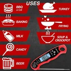 Instant Temp Reading Thermometer will make cooking more enjoyable and easier!- You love to cook a favorite meal for your family and friends? - You feel that can cook it even better, but something is missing? - You’re often told that a dish is not well cooked or overcooked/overdone? Our Newest Waterproof Instant Read Thermometer will help you become a real guru in the cooking world: ➤ Instant & precise temp read within 2-5 seconds ➤ Min/Max temperature reading save capability ➤ Measuring range from -58℉ to 572 ℉ ➤ High accuracy ± 1 degree ➤ Robust ABS plastic body ➤ IP67 Waterproof certification ➤ Celsius & Fahrenheit readings ➤-Large Bright LCD Backlit display, easy to read ➤ Stainless Steel probe ➤Auto shut off - standby period of 10 minutes ➤Auto shut off button when closing the probe ➤A comfort handle grip for better handling ➤Can be re-calibrated when needed using a simple procedure ➤ Heavy-Duty, Long-Lasting Battery life ➤ Handy loop hole for easy storage ➤ Meat temperature guide laminated on the body Package Included: 1 x Digital Food Thermometer(incl.CR 2032 Battery) 1x Meat Temperature Guide 1 x Extra Battery 1 x User Manual NOTICE: 1.Do not touch hot probe with bare hands. 2. Do not leave the thermometer in the oven while cooking. 3. Do not completely immerse the digital thermometer in water for minutes. 4. Please wash the metal probe in soapy water. 5. Please clean the thermometer by hand or using water. SO EASY TO USE:Works right out the box! digital thermometer with foldable 4. 6 Food grade stainless steel probe and auto-on/off function, open the probe to turn on, fold the probe to turn off.EASY to use, storage and carry. With the included battery you can start using the thermometer right away. It’s the perfect solution for grilling, baking, deep frying, making candy, or uses it to test the temperature of your Liquid, beer, wine, tea, coffee, milk, soup, etc. SUPER FAST and ACCURATE:Takes a temperature in a little as 2-3 seconds, and is accurate to +/-1 degrees with a wide range of -58℉-572℉. No more waiting over a hot stove or grill for the temperature to settle. Find out the exact temperature of your food in a second! For maximum measurement accuracy a calibration function is provided. Perfect for indoor outdoor cooking, grilling, BBQ and so on. WATERPROOF PRACTICALITY:Every gap in the thermometer has a waterproof treatment, IP67 rated waterproof, the meat thermometer can be washed under running water without fear! With a strong ABS plastic body, it can withstand accidental drops or other impact accidents. With a waterproof and strong break resistant body, the food thermometer is highly durable and resilient. Great for grilling outdoors. Powerful:Easily switch between ℃ and ℉, the wide and bright LCD display with backlight makes it easy to read the temperature even when cooking outdoors or at night. Easy to calibrate and beautifully packaged, it makes an ideal gift for cooking or grilling enthusiasts, allowing you to cook mouth-watering meals effortlessly. Safe to Use & Warranty:We stand by our products so you can make your purchase with confidence. Our products are rigorously tested and made with love because we believe that you deserve the best. Please feel free to contact us via Amazon directly if you have any questions or need any help.