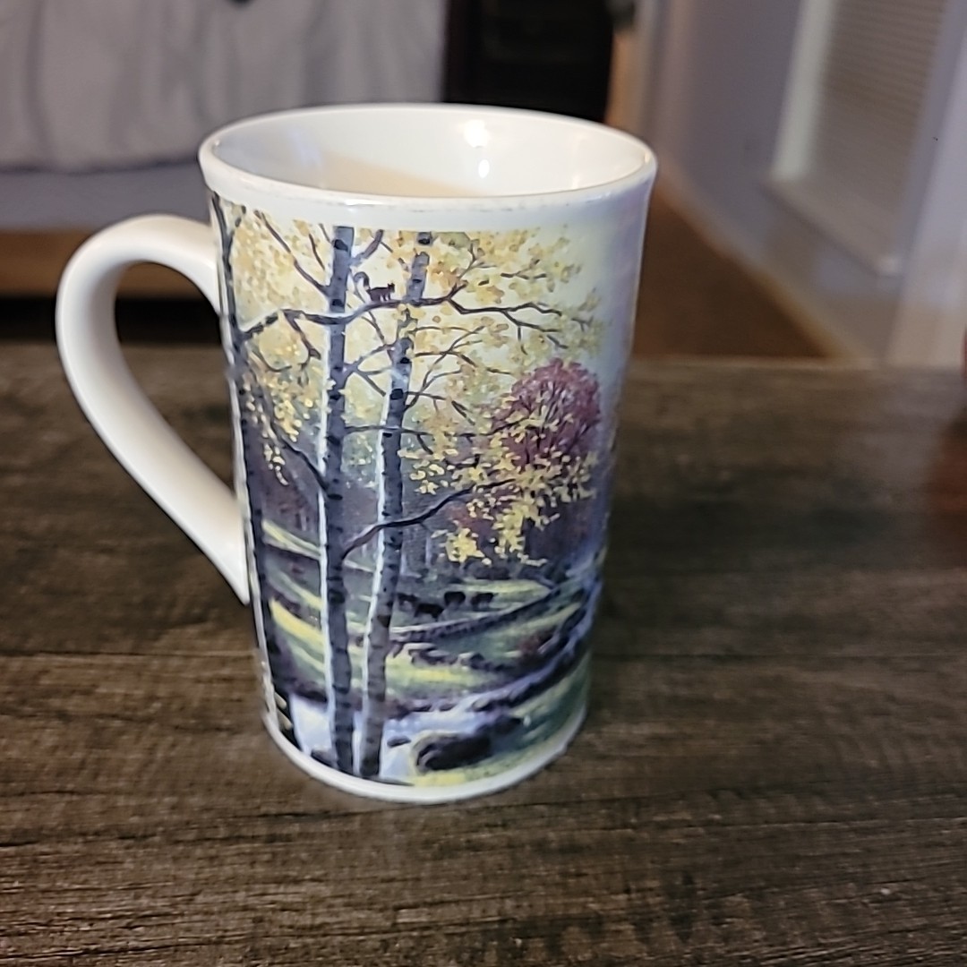 The Thomas Kincade "The Aspen Chapel" 2001 Tall 12oz Coffee Mug Cup by DesignPac Inc. is a beautifully crafted white coffee cup featuring a stunning design of a chapel in aspen trees. This tall mug is perfect for enjoying your favorite hot beverages while adding a touch of elegance to your kitchen or dining area. Made by a reputable brand, this coffee mug is both functional and visually appealing, making it a great addition to your collection of dinnerware.