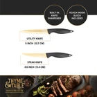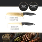Thyme & Table 15-Piece Knife Block Set is a part of the Thyme & Table Essential Collection. Each knife is made of stainless steel with an ergonomic comfort grip. The knife block is made of Acacia wood and has a built-in knife sharpener. The 15-piece set includes: Stainless Steel Shears 8" Chef Knife 8" Bread Knife 8" Carving Knife 7" Santoku Knife 6" Boning Knife 5" Utility Knife Six 4.5" Steak Knives 3.5" Paring Knife CARE AND USE Hand wash before first use. Do not use in dishwasher. Stainless Steel Blades Acacia Wood Block Included Built-In Knife Sharpener On Feb 18, 2025 at 21:25:26 PST, seller added the following information: