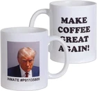 Trump Funny Coffee Mug: Front view – trump mugshot mug with centered Donald Trump mug shot and inmate number; back view - white mug with centered “MAKE COFFEE GREAT AGAIN”. A great gag gifts idea. Dishwasher safe and microwave safe, made of white ceramic with high heat resistance. Glazed with a glossy finish which looks great in any setting, the comfortable C-shaped handle ensures an easy and secure grip. Great Gag Gifts Idea: The Trump mug is a great trump merchandise for mom, dad, husband and wife. Standard 11 Ounce Coffee Mug: 3.15 inches diameter, 3.7 inches high. Looking for a gag gifts for your friends? Get your Trump coffee mug! The front view of this coffee mug is taken from Donald Trump’s mugshot in the Fulton County jail, back view is centered “MAKE COFFEE GREAT AGAIN” logo. The Trump mugshot mug made of high quality white ceramic which is dishwasher safe and microwave safe. A funny coffee mug gift for men women. Capacity: 11 oz Height: 3.7 inches Diameter: 3.15 inches