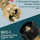 Easy Filling: The 90-degree elbow design makes it easier for gas to flow to the small cylinders. Simply attach to your large tank and your 16 oz tanks for refilling in 1 minute Upgraded Design: Featured with a propane ON-Off control valve, prevents gas leaks when connecting gas cylinders. You can easily control the refilling process with safe Safe Structure: Corrosion-resistant solid brass provides a better sealing effect. Additionally, the built-in safety features effectively prevent the danger of overfilling the gas cylinder Standard Fitting: QCC-1 x 1"-20 Female Throwaway Cylinder Thread, ensure the propane bottle adapter fits your propane tanks Use with Ease: Easily refills your 1 pound bottles multiple times without tools. Helping you save on the cost of buying new green propane gas cylinders
