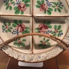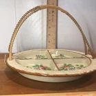 This vintage Tashiro Shoten ceramic platter/tray features a floral motif, a round shape with a 9-inch diameter, and four compartments. It has a bamboo handle, a 1950s style, and is hand-painted with an embossed rim. Made in Japan in 1954, this medium-sized serving dish is perfect for all occasions. TASHIRO SHOTEN Ltd. was a porcelain shop in Yokohama, Japan; active before WWII up until 1954. SHOTEN indicates the name for a shop which is selling products from its own kiln. Vintage determined by ‘Elephant Mark’ , being one of the last before being closed. Hand painted, wire /plastic , imitation bamboo, handle.