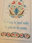 1964 Berggren-Trayner Scandinavian cutting board. White with floral painting. Reads "God May be Found Midst the Pots or the Posies". Board is 8" across and 17" long and 3/4" deep. There is a mark across the board that can only be seen at an angle in a particular light. You can not see it straight on and I was not able to capture it in a picture. It is not a gouge and cannot be felt. Aside from that, board is in very nice condition.