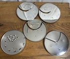 The Vintage Cuisinart DLC7 Food Processor Disc Blade Holder Set includes 5 stainless steel blades in a disc set for the Cuisinart DLC-7 model. This full-size food processor blade set from Cuisinart, made in Japan, offers versatile capabilities such as slicing, grating, and shredding with its multipurpose blades. The detachable parts make it easy to clean and use for various food preparation tasks in the kitchen. Pre-owned condition. See photos. Blades include: DLC-037 Medium DLC-033 3x3mm DLC-048 8mm DLC-042 2mm DLC-044 4mm