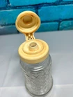 This syrup/honey glass pitcher with a plastic top measures only 5" h. It has stood the test of time and is in great condition.