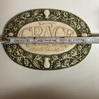 This vintage Amscan plaque and stand is a beautiful addition to any room. With a classic style and a 3D effect, it features hand-painted vines and fruit in olive green, cream gold, and glossy finishes. The plaque is small, measuring 4 1/2" in height and 6 1/2" in width, and it comes with a hanging feature for easy display. The plaque is perfect for anyone who loves art, inspirational words, or religious themes. It is made of ceramic material and can be cleaned with a damp cloth. The plaque is not personalized and does not require any additional parts. Its model name is "Grace" and it weighs 10.5 ounces. This plaque is a great way to show your thankfulness and add a touch of cottagecore, Victorian, or momcore vibes to your home. Excellent condition Comes with stand or can be hung on wall