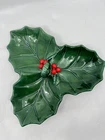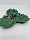 This vintage Lefton #6009 divided relish dish features a festive Christmas theme with green holly detailing. Made of ceramic and porcelain, this serving piece is from the 1970s and was manufactured in Japan. The dish is perfect for serving snacks or dips during holiday gatherings, adding a touch of seasonal charm to your table decor. The holly design and holiday colors make it a delightful addition to your Christmas dining collection. In great condition. Please see pics to verify.