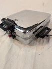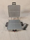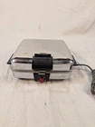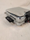 This vintage waffle maker/griddle from McGraw Electric is a must-have for any collector or lover of retro kitchen appliances. With a chrome finish and art deco style, this standard waffle maker has a square shape and is powered by 1300 watts. It features temperature settings, a removable surface, and three settings/programs to choose from. Tested and working Made in the United States during the 1950s, this Fostoria model 6A waffle maker is a multipurpose tool that can also griddle and cook bacon. It comes with reversible cooking plates and is portable for easy storage. Perfect for making waffles, this vintage waffle maker is a unique addition to any kitchen.