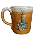 The Vintage Mother Mary Cup features a classic design with a metal embellishment depicting the Blessed Mother praying with children. This rare 12oz ceramic coffee mug is adorned with a brown color scheme and a religious theme, making it a special piece for those who hold the Catholic faith or have a devotion to Mother Mary. The mug is 3.5 inches in height and 4.3 inches in width, perfect for enjoying your favorite hot beverage while reflecting on faith and spirituality.