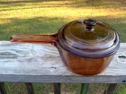 Up for auction here is a vintage Corning Pyrex Vision amber glass 1 liter sauce pan with its original lid ca. 1970's. It is in very good pre owned used condition with only some light use wear but No chips, cracks, or repair. Please see pics as they are part of the description. This sauce pan measures approx. 4 3/4" with the lid, 3" without by 6" wide across the top and 10 5/8" long from handle to outer edge. It is marked on the handle *VISIONS FRANCE V-1-B*, and "PYREX P 8 1 C" on the outer edge of the lid. Folks, this is a great vintage Visions amber glass 1 Liter sauce pan with lid and it would go great in a collection or home. USPS Priority/Parcel and FedEx Ground/Home Delivery mail true calculated shipping costs is based on a insured well wrapped and packed 4 pound shipment, box size 12x8x6. Please see the available shipping services with calculated shipping costs under the Shipping & Payments tab above the Item Specifics on our auction page or scroll down to the Shipping, returns & payments section and hit the small arrow on the right of Returns, thanks. NO WORRIES ... YOU CAN BID HERE WITH CONFIDENCE! We are a true U.S. seller, NOT a drop shipper and item ships from our U.S. location! As always ... Low Opening Bid and Never a Reserve! Plus, we NEVER end an auction early or CANCEL a bid after the auction has ended! PLEASE BID ONLY IF YOU ARE SERIOUS and INTEND TO PAY IF YOU ARE THE SUCCESSFUL WINNER! Our quality merchandise come directly from Estate Sales, private homes, thrift shops, and local auctions hand picked and purchased by my husband and me. As most of you may know, most vintage or used items will have some age and/or wear, and here we like to describe as accurate as possible and show many photos, so you know exactly what you are bidding on. So please read our detailed description and look at the pics as they are part of the description and ask any questions prior to a bid. Lord knows we are all only human and do make mistakes, but we honestly try very hard not to here so please rest assure and bid with confidence. Typically, our photos are shot outdoors under natural lighting on a not so fancy old railroad tie, rail, against our home, or somewhere outdoors, so please excuse any camera reflection glares, white spots or specks and shadows. Yes, we are old school and our descriptions also may be more lengthy than others, but we like you know exactly what you are buying/bidding on so there are no surprises. Please read the entire description, see all photos and ask any questions before placing a bid. All emails/messages are answered. We are rural and ship by USPS Priority/Parcel and FedEx Ground/Home Delivery (true calculated shipping) and (free shipping) for local pick-up. We also recycle and use over-sized boxes and new high quality packaging materials to ensure your item(s) will arrive to you safe and unharmed. We do not charge for boxes, packaging materials, gas, or handling. We do not profit any money from shipping costs. You are only charged true actual calculated postage and all items are shipped fully insured with carrier. We ship same or next day unless it is a holiday or a weekend, then shipment will be the following business work day. We ship to buyers in the United States, we do Not ship Internationally. Payment is due within 3 days of close of auction, unless you have made prior arrangements with us. A non paying bidder notice will be issued after four days and a strike goes against your account. Please bid only if you are serious and intend to pay within the allotted time frame. North Carolina buyer must pay 7% sales tax. We combine shipping to save you money and give shipping discounts on 3 or more auction wins. The eBay combined shipping calculator is not always correct, so if you win 2 or more auctions please request or wait for a combined invoice for appropriate total. Our items come from a smoke free home. We do have dogs, but all items are stored in a pet free environment until delivery day. Claims/Refunds - Please DO NOT request a return on merchandise damaged in shipping. Insurance claims can only be filed upon proof of damage (proof of damage is pictures which are most needed to file claims) and before issuing you a refund. So if your item happens to arrive to you damaged in shipping, please contact us and DO NOT THROW ANYTHING AWAY. In order to file a USPS/FedEx online claim, we must have pictures of the shipping box at every angle, shipping labels (tracking/addressee), bubble wrap, wrapping/packing materials (packing/partitions), and of course the breakage. Once we receive all the requested pictures, we can send you a full refund ASAP. We usually don't have problems, but you just never know with shipping carriers these days with all their automated robotic sorters and all. If there is a problem with your order, simply contact us. As an old-school eBay Seller, we list in the spirit in which eBay was founded; a place to find vintage, unusual, rare, hard-to-find, one-of-a-kind, and various quality items at affordable prices! SHOP, BID and BUY WITH CONFIDENCE! SATISFACTION GUARANTEED! Please, no buyer's remorse and ask any questions before placing a bid. We have been auctioning on eBay for 23+ years and truly only want the very best for you and us both. We honestly describe all our items to the best of our knowledge and ability and show many photos, but if you have a question(s) or just need further info. or pictures, please let us know. We don't just want you satisfied; we want you to be a happy returning customer for years to come! ;) THIS IS A 10 DAY AUCTION and HIGHEST BID WINS! GOOD LUCK IF YOU SHOULD BID! THANKS and GOD BLESS!