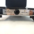 The Vintage Rival 60s 70s 4 Waffle Maker Grill No. 90 is a collectible small appliance that brings a touch of retro charm to any kitchen. This standard waffle maker, manufactured in the United States during the 1960s or 1970s, features a rectangular shape with sleek silver and chrome finishes. It has a capacity for 4 waffles at a time and includes a pop-out tray for easy cleanup. With its automatic features and plug-in power source, this waffle maker offers convenience and nostalgia for cooking enthusiasts looking to add a unique piece to their collection.