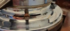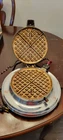 Vintage Waffle Maker Dominion Electric in working condition. Has 3 heat settings via a sliding dial. Has a ready light on top. Fabric wrapped cord. Great condition. Mid century.