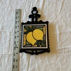 Vtg MCM Cast Iron Black Framed Tile Trivet Lemon 70s Cottagecore Farmhouse This vintage mid-century modern trivet features a black framed tile design with a lemon pattern. The small square shape measures 5 inches in width and 9.5 inches in height, with a sturdy handle for easy use. Made of cast iron and ceramic materials, this original piece is perfect for any collector of kitchen tools and gadgets. The trivet is ideal for protecting hot pots and pans, and its retro style adds a touch of farmhouse charm to any kitchen.