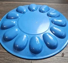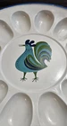 Retro! Holds 12 deviled eggs. Teal, blue, & avocado green peacock with blue colored rim & bottom. Has one itty bitty paint chip on rim & bottom has a few scratches. Due to its age I'm sure.