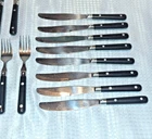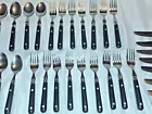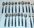Upgrade your table setting with this stunning 40-piece Washington Forge Black Mardi Gras flatware set. Known for its sleek design and mid-century appeal, this set is perfect for daily use or special occasions. Crafted with stainless steel and black handles, it brings durability and a touch of elegance to your dining experience. Set Includes: 9 tablespoons 7 teaspoons 7 dinner forks 9 salad forks 8 knives Key Features: Classic Mid-Century Design: The minimalist black handles with rivet detailing reflect the popular aesthetics of the mid-century era. Durable and Functional: Crafted from high-quality stainless steel with sturdy, ergonomic handles. Good Used Condition: Minor signs of wear consistent with age and use, but no major flaws, ensuring years of functionality. Versatile Use: Great for both casual and formal dining settings, making it a versatile addition to your collection. Dimensions: (Approximate) Knives: 9" long Forks and spoons: Standard flatware size Collector’s Insight: Washington Forge's Black Mardi Gras pattern is a sought-after flatware design from the mid-20th century, celebrated for its timeless style and durability. These pieces are often cherished as a combination of utility and collectible charm. ⭐ Shop & Save: Check out my store for more great finds across all categories, including unique treasures! Stock up on multiple items to save on shipping.