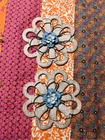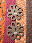 round loops, weathered wood, small metal petals, blue flowers white inside. 11" across the widest part. 11" tall. Really pretty with the wood, then having the light blue contrast. They look so pretty on your wall.