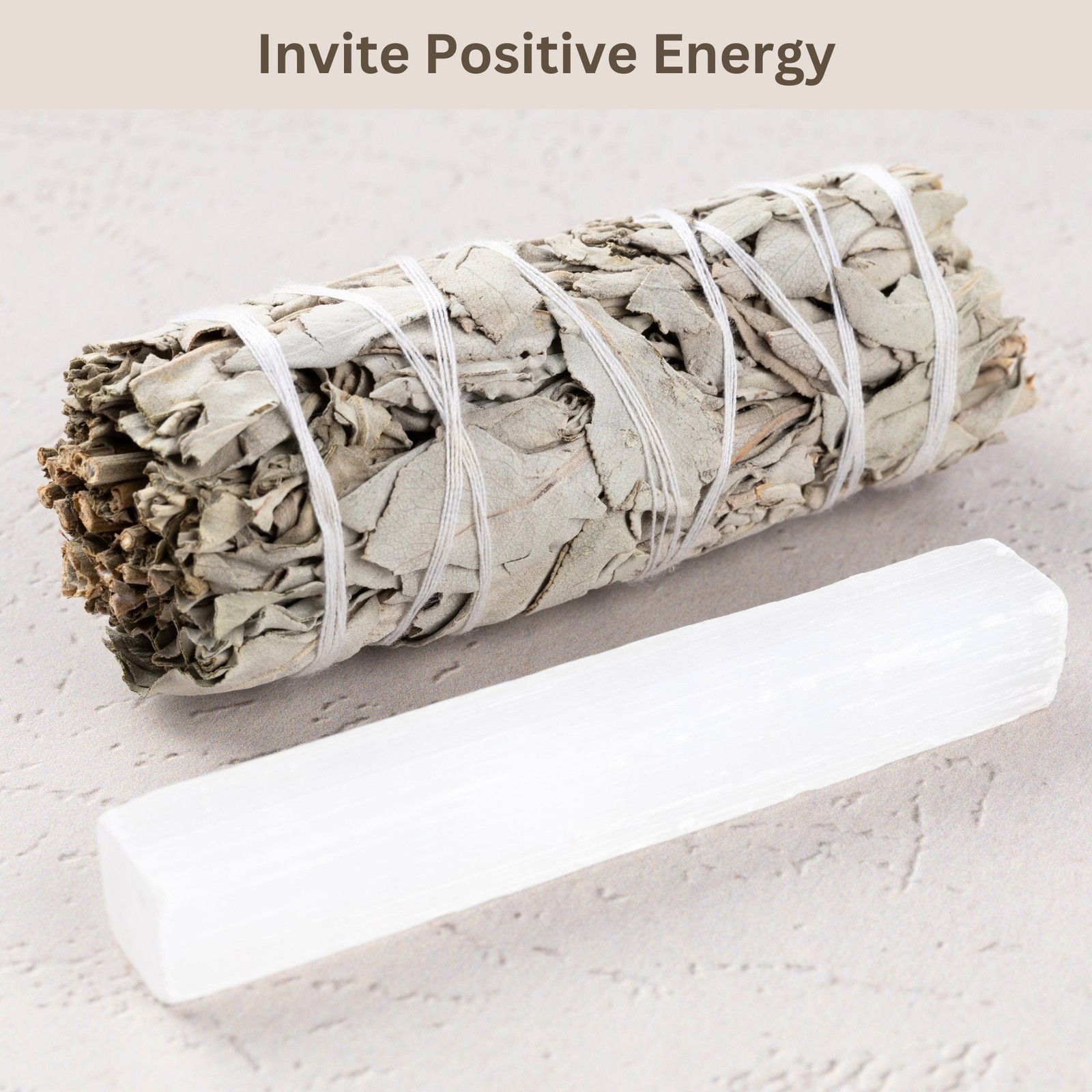 White Sage Smudge Sticks 3pc & 4" Selenite Stick, Cleansing & Protection Set