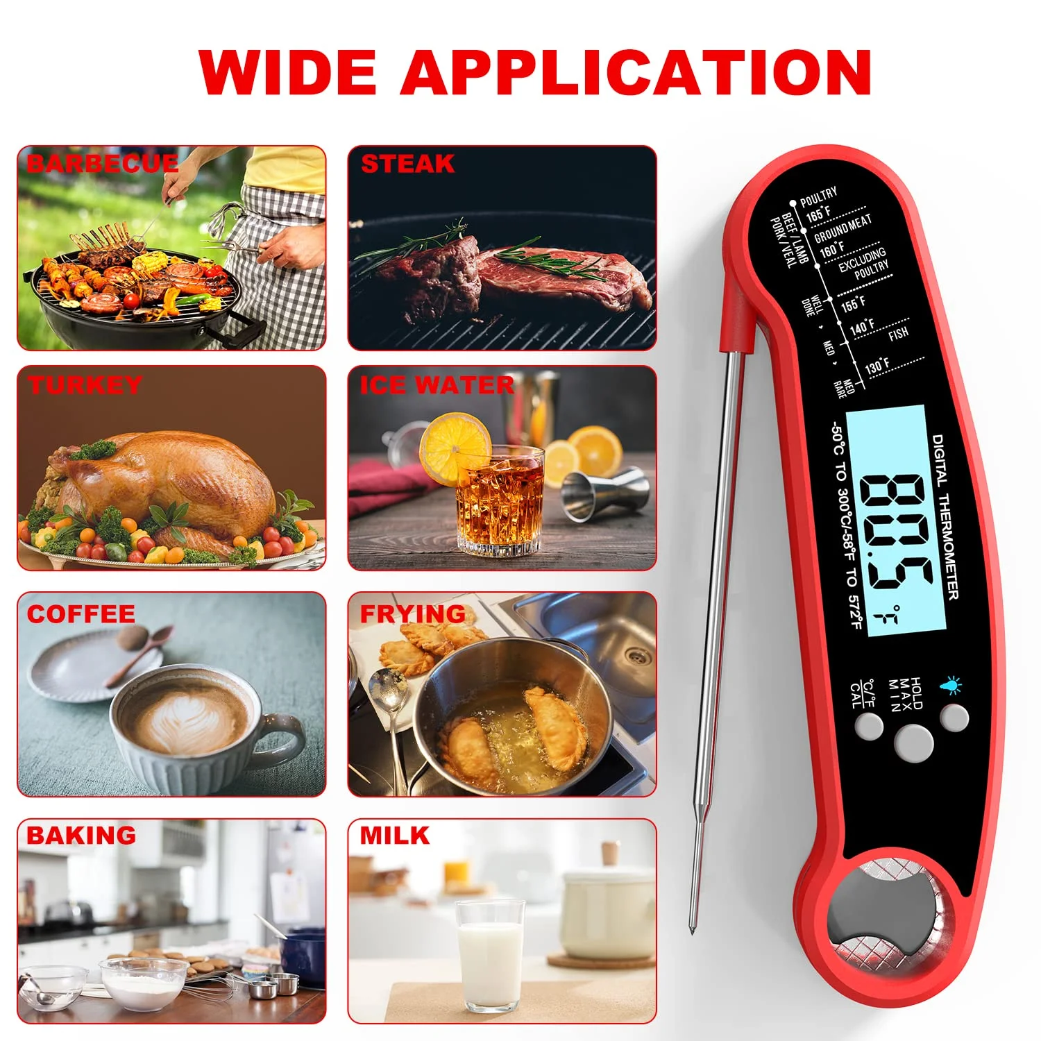 About this item Accurate Reading & Ultra Fast - Equipped with a food grade stainless long probe, thermometer takes the temperature in a little as 2 seconds and is accurate to ±1°C(1.8℉) degrees with a wide range of -58℉~572℉(-50°C~300°C). The food thermometer is perfect for indoor/outdoor cooking, grilling, BBQ and more. No matter what you're cooking, this instant read meat thermometer is the best assistant for you. Waterproof Design & Durable Material - With professional IP67 rated waterproof design, the food thermometer can be washed under running water without fear! Incredible waterproof performance makes it easier to clean. What's more, the meat thermometer has a strong ABS plastic shell. Even if the thermometer is accidentally dropped or hit, it can be easily protected from serious damage. thermometer works with great durability and lasts longer than others. So easy to Use & Multi Function - Works right out the box! The digital thermometer is pre-calibrated, so you don't need to calibrate by yourself. With Auto On/Off function, you can unfold the probe to turn on or fold to turn off. Press the button to switch the temperature between Centigrade and Fahrenheit. The digital meat thermometer not only comes with a large digital LCD backlight screen, but also has Hold Button which lets you see the temp easier. Easy Storage & Built-in Magnet - The instant read thermometer has built-in magnet and a hanging hole with bottle opener function. After cooking finished, you can either hook the food thermometer to the wall or attach its magnetic back to the refrigerator or oven within your reach. The meat thermometer is easy to store. Whether refrigerator, oven, kitchen hook or other places, it can be easily stored wherever you want. Packing listing: 1 x Meat Thermometer. 1 x User Manual. 1 x Food Temp Chart. 1 x CR2032 Button Battery (installed). 1 x Battery Case Opener.