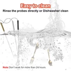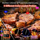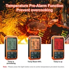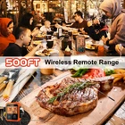 The meat thermometer is a great cooking assistant for you. 500FT Remote Range&Fast and Accurate Instant Reading - This wireless meat thermometer can monitor 500FT remote range with its strong and professional remote signal. The 3 meat probes have fast and accurate sensitivity and heat resistance. This instant-read food thermometer can monitor the temperature range of 14˚F to 572˚F (-10˚C to 300˚C), with ±1.8˚F (+/-1˚C) accuracy. You can make cooking with them and lock the nutrition of food. Temperature Pre-Alarm Function - A new pre-alarm function has been added to the meat thermometer. When the current temperature reaches 95% of the target temperature, the orange backlight starts to flash, indicating that the cooking is nearing completion. When it reaches the target temperature, it will flash red backlit. You have enough time to respond and ensure that the food not overcooked. 8 Different Preset Temperature Modes - The bbq thermometer has 6 different types of meat and a PROG mode for you to choose from. The Probe3 has a mode: BBQ. The HI/LO function is for you to measure the ambient temperature of the grill/smoker/oven. This grill thermometer has 3 levels of doneness. You can choose the doneness according to your preferences. Splashproof Transmitter & 3 Washable Color-Coated Probes - The 3 different color meat thermometer probes help you eliminate the guess when you monitor the different food. The probes and cable are waterproof so you can put them in the dishwasher or wash them with water directly. The transmitter is specially designed to be splash-proof.So you don’t worry about water splash on the surface of the transmitter. Wide-view Backlit Screen and Component- The meat thermometer wireless with a wide-view screen in which you can read the temperature digits clearly. It includes a transmitter, a receiver, 3 probes, and a clip. It will need 4×AAA batteries which not include and need prepare in advance.