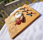 cutting board, cheese board charcuterie knife set, gift. Your uniquely personalized bamboo cheese board and utensil set makes a perfect gift set for couples, weddings, engagement, housewarming, bridal showers and new house parties. If you are looking for a custom gift that is unique, this engraved bamboo cheese board is perfect fit for you. Dimension: 32cm x 41cm x 4cm (12.6” x 16” x 1.5”) The set consists of: • a wooden board • a cheese fork • a cheese knife • a cheese slicer The one of a kind bamboo cheese board has an easy to clean surface that is perfect for cheese cutting. It includes 3 utensils, including a fork, slicer and a knife. The top surface of the board and all the wooden-handled utensils are personalized with a letter or monogram of your request. How to personalize: You can choose the styles of your request from the STYLES MENU in the pictures. You can choose the font of your choice from the picture of FONT MENU. Now, you can enter your engraving instructions in the message to seller box.