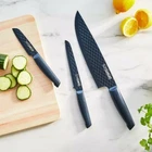 Set includes: 8” chef’s knife, 5” serrated utility knife, and 3.5” paring knife Premium nonstick coating with diamond texture creates air pockets, so food won’t stick to blade Razor-sharp edge ensures exceptional precision and performance Crafted from 3CR13 stainless steel for a lightweight feel with incredible durability Ergonomic handle features slip-resistant surface to keep you safe Prep without worry—free of PFAS, PFOA, lead, and cadmium Rust resistant Dishwasher safe Unique diamond-textured surfaces create air pockets that prevent food from sticking to blades as the extremely sharp edges slice with precision. Lightweight stainless steel design lets you breeze through prep tasks, while the comfortable, slip-resistant handles helps prevent accidents. Included sheaths protect knives (and hands!) when not in use. Plus, unlike many knives, the Blue Diamond collection is dishwasher safe for effortless cleanup