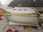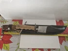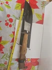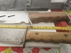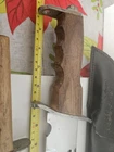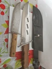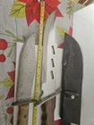 Homemade 2 knife set with sheath.Large 1 is 18 inches overall with a 12 inch blade. The smaller 1 is 12.5 long with an 8 inch blade No id markings on either knife. Big one is shiny with no blemishes and smaller 1 blade is tarnished.